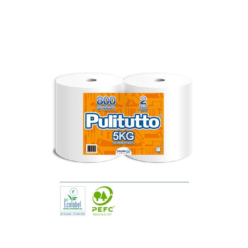 Bobina Pulitutto, nuova lavorazione microincollata 2 veli. Prodotto certificato Ecolabel e Pefc. Ecofood Paper. Idoneo al contatto con alimenti secchi. (Alimenti per i quali non sono previste prove di migrazione.)