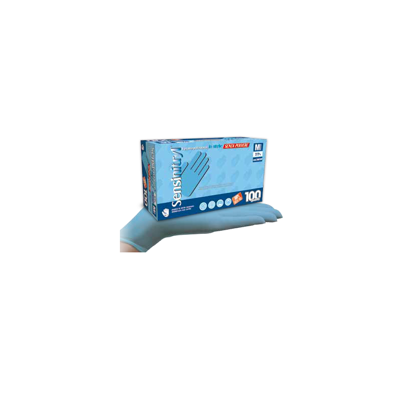 Guanti monouso in nitrile, senza polvere con processo di clorinatura "on-line" (immersione in bagni di cloro), questo processo garantisce l'assenza di polvere, non sterili, da esaminazione. Latex Free, preserva da possibili reazioni allergiche correlate alle proteine del lattice di gomma naturale. Di colore azzurro, ambidestri con polsino salvastrappo. Superficie micro-ruvida che garantisce la massima sensibilità ed una presa migliore. Ottima resistenza chimica a detergenti, detersivi concentrati, idrocarburi, eteri e freon. Idoneità al contatto con gli alimenti.